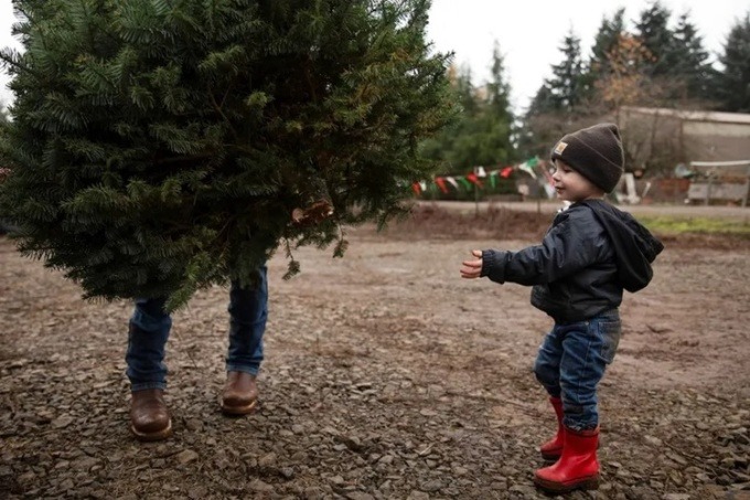 Ryan Swader vác một cây thông bên cạnh con trai tại trang trại Tucker Tree ở Salem. Ảnh: Reuters.