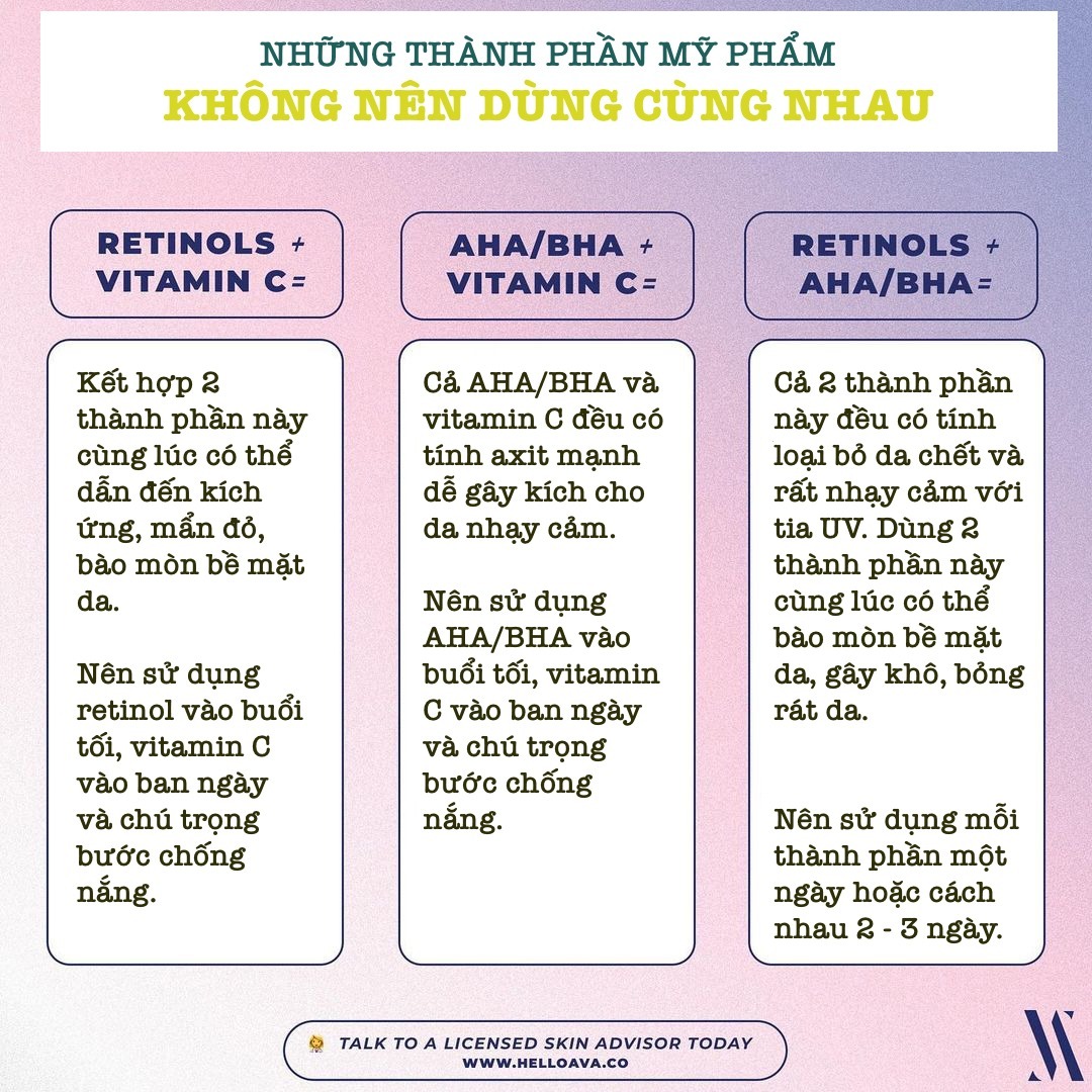 Một số thành phần chăm sóc da kỵ nhau, không được khuyến cáo dùng cùng lúc có thể kể đến: Retinol-AHA/BHA, retinol-vitamin C, vitamin C-AHA/BHA... Khi dùng cùng lúc, các thành phần này bị biến chất, không phát huy được tác dụng, có thể khiến da quá tải, kích ứng.