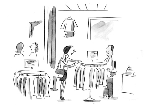 Hai vợ chồng vào một cửa hàng thời trang, khi người vợ đang thử quần áo, anh chồng quay ra ngắm một cô khác cũng đang thử đồ.