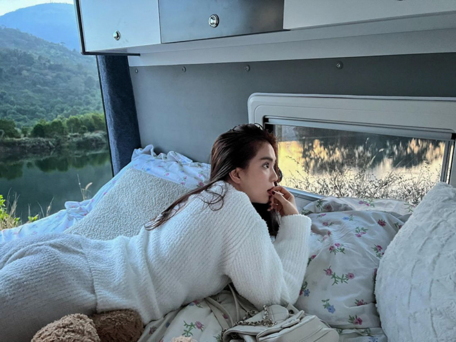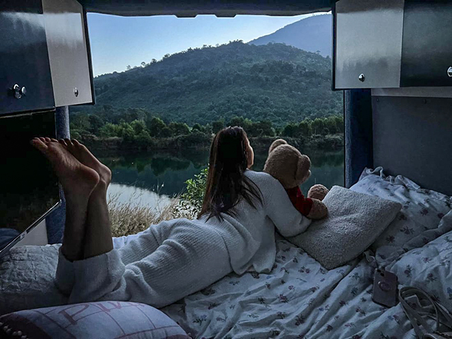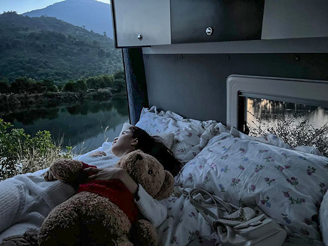 Khu vực rộng nhất chính là buồng ngủ với một chiếc giường cỡ lớn có thể đủ cho hai người nằm thoải mái. Theo hình ảnh của Ngọc Trinh chia sẻ thì có thể thay nơi nghỉ ngơi của cô rất “chill” với hai chiếc gối và một chú gấu bông, phía trên đầu là khu vực tủ đựng đồ đi kèm những vật dụng dành cho cắm trại.