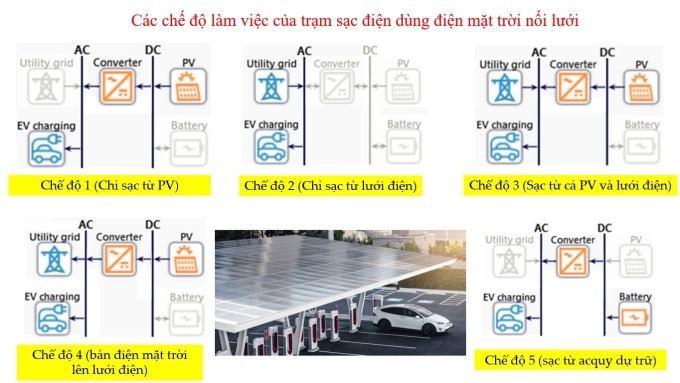 Trạm sạc điện cho EV có năm chế độ hoạt động. Ở chế độ chỉ sạc PV, trạm sạc bị ngắt kết nối với lưới điện, chỉ dùng điện từ năng lượng mặt trời. Nếu trời không có bức xạ (buổi tối, ngày mưa, nhiều mây mù), điện năng của trạm sạc sẽ được lấy trực tiếp từ lưới điện.