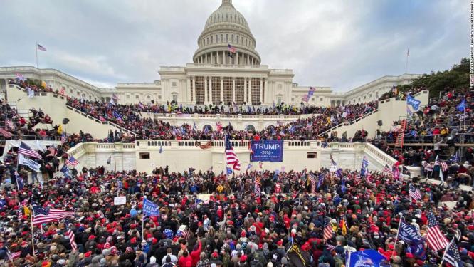 Đài CNN trong khi đó cho thấy một h́nh ảnh trái ngược ‘một chăm phần chăm’. Toàn là h́nh dân đang giận đỏ mặt, chửi bới ḥ hét như mổ ḅ, lại có cả cảnh nhiều đám dân biểu t́nh giằng co rào cản với cảnh sát, rồi có luôn một nhúm đâu nửa tá đập kính một cửa sổ, chui vào trong ṭa nhà quốc hội, bị cảnh sát chỉa súng bắt nằm rạp xuống đất.