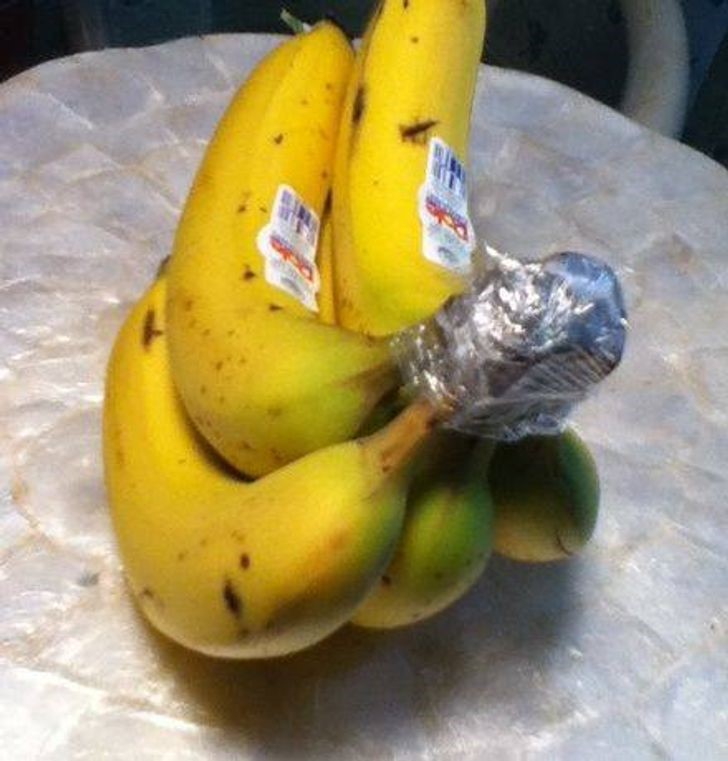 7. Quấn màng bọc thực phẩm quanh cuống chuối để chuối không bị chín quá