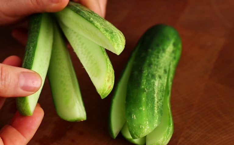 Bước 1: Rửa sạch dưa chuột, chẻ dưa làm 4 nhưng không cắt rời từng phần