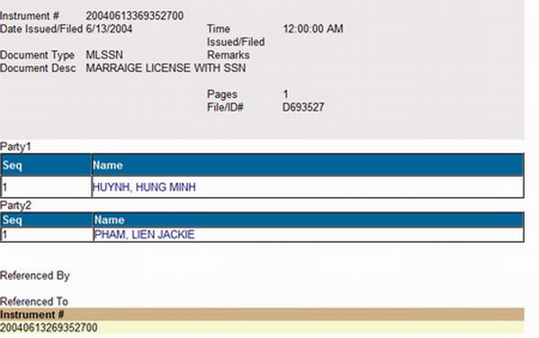 Còn nhớ khoảng vài năm trước đây, tờ hôn thú của Đàm Vĩnh Hưng và người vợ “bí ẩn” ở Mỹ từng khiến dư luận trong nước bàn tán xôn xao khi bất ngờ được lan truyền trên mạng xã hội . Theo đó, trong tờ giấy này, ông Huỳnh Minh Hưng (tên thật của ca sĩ Đàm Vĩnh Hưng) đã kết hôn với người phụ nữ có tên Jackie Liên Phạm kể từ ngày 13.06.2004. Giấy kết hôn mang mã số D693527, do mục sư JC Chevalmp làm chủ tế và người làm chứng là Paul Huỳnh.