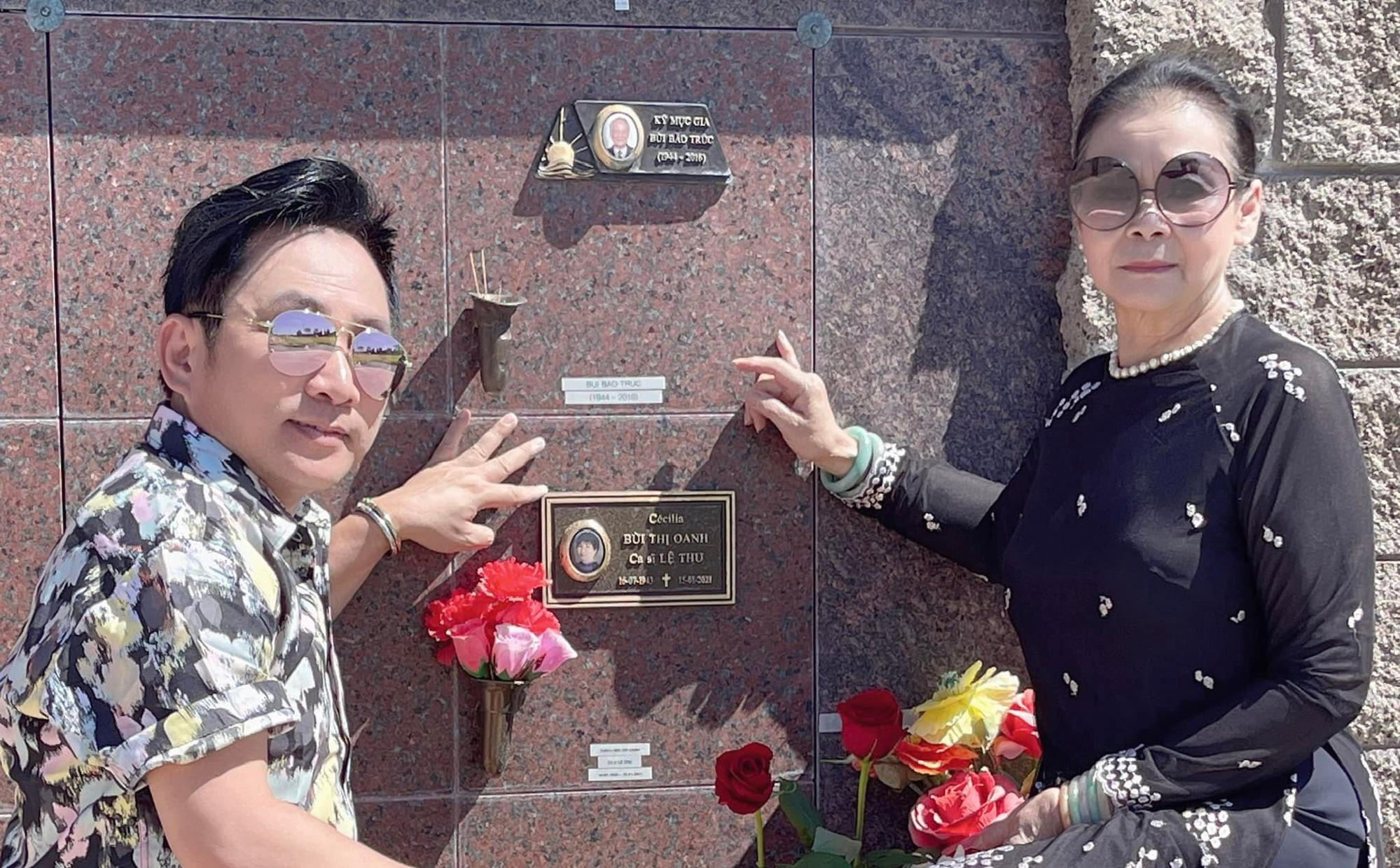 Danh ca Khánh Ly cùng ca sĩ Quang Thành đến thăm mộ danh ca Lệ Thu. Ảnh: TL.