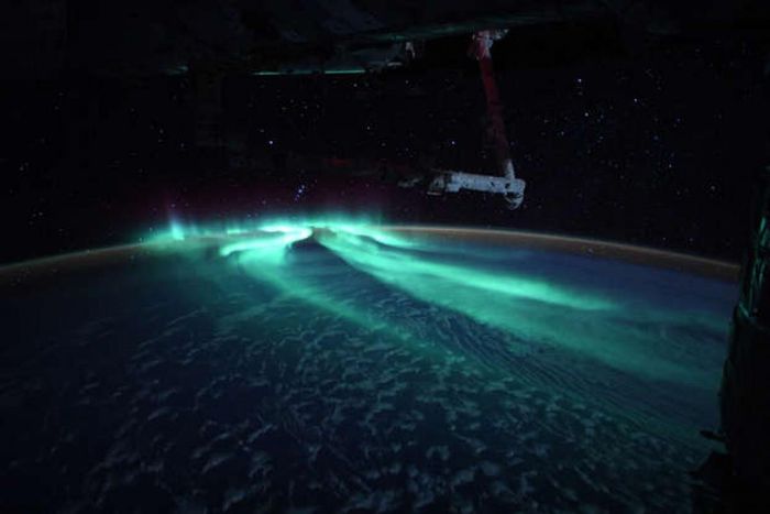 Một hình ảnh được phơi sáng trong thời gian dài cho thấy những vì sao lấp lánh, cánh tay robot tự động Canadarm của trạm vũ trụ và quầng sáng phía trên Trái Đất.