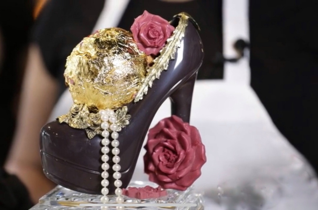 Bánh được đặt trên một chiếc giày cao gót bằng chocolate, với chân đế là một chiếc cốc pha lê và trang trí thêm bằng những bông hoa hồng chocolate vô cùng bắt mắt.