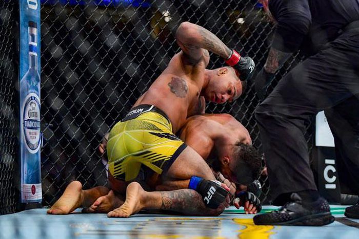 Tiếp đó, Michael Morales đã ghì chặt đối thủ rồi tung ra loạt đấm rất mạnh khiến Trevin Giles chỉ biết ôm đầu chịu trận. Lúc này, trọng tài buộc phải can thiệp và công nhận chiến thắng knock-out cho võ sĩ người Ecuador.