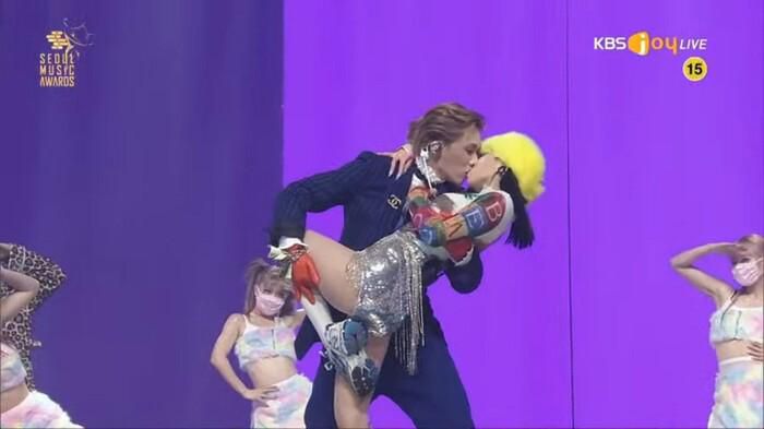 Trong tiết mục tiếp theo, HyunA có màn kết hợp với bạn trai của mình là Dawn. Vốn là một cặp đôi có cá tính mạnh, thế nên sân khấu của cả 2 cũng hết sức đặc biệt. Cận cảnh màn khóa môi của HyunA và Dawn trên sân khấu khiến nhiều người thích thú. Dù cả 2 thường xuyên khoe trên mạng xã hội những khoảnh khắc tình cảm, thế nhưng "bạo gan" trên sân khấu thế này quả thật rất "chất lượng".