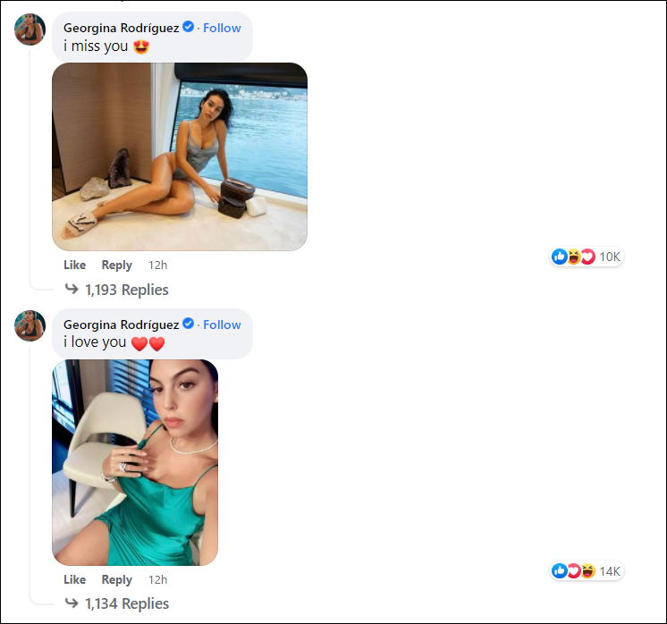 Không chịu kém cạnh, Georgina kêu: "Em nhớ anh" và "Em yêu anh", bằng hai tấm hình mlem không kém. Màn "đánh dấu chủ quyền" của người đẹp mang trong mình dòng máu Tây Ban Nha - Argentina cũng thu về lượt like và comment khủng.