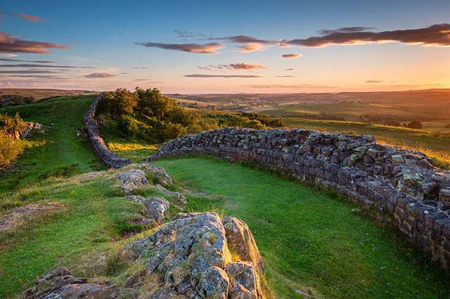 Bức tường Hadrian, Anh: Hadrian’s Wall được người La Mã xây dựng như một phòng tuyến để bảo vệ khỏi các bộ lạc phía bắc. Bức tường là một trong những biên giới nổi tiếng nhất của Đế chế La Mã. Việc xây dựng bắt đầu vào năm 122 sau Công nguyên, mất 6 năm và 15.000 người để hoàn thành.