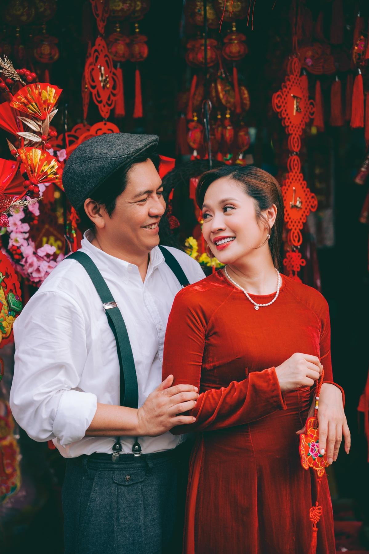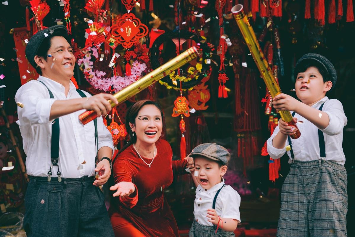 Đức Thịnh - Thanh Thuý cùng hai con xuống phố chụp ảnh theo phong cách Sài Gòn xưa. Trong sắc đỏ rực nơi con đường chợ Tết, cả gia đình tươi cười và trân trọng thời gian được bên nhau.