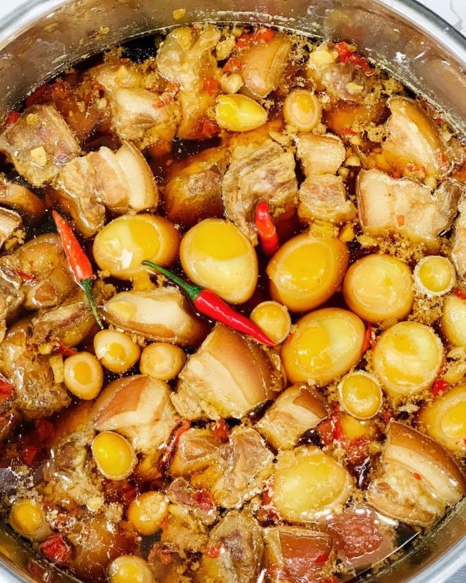 Tương tự Kỳ Duyên, Bảo Thy cũng kho thịt với nước dừa nhưng cô chọn thành phần gồm trứng cút và thịt heo nhiều nạc, ít mỡ ăn cho đỡ ngấy.