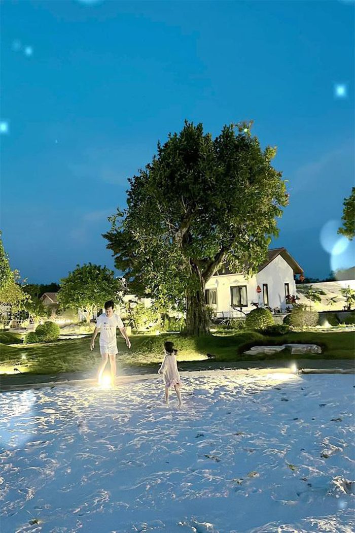 Ngoài không gian thoáng đãng với nhiều cây xanh, khu nhà vườn của vợ chồng Trường Giang - Nhã Phương còn có một bãi cát trắng rất rộng cho cô con gái thoải mái vui chơi.