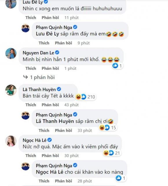 Ngay bên dưới hình ảnh này, loạt bình luận đều gửi lời ngợi khen đến vẻ quyến rũ của Quỳnh Nga. Các đồng nghiệp từ nam đến nữ đều phải thừa nhận không chỉ dừng lại một giây mà dành nhiều thời gian hơn thế nữa để chiêm ngưỡng sắc vóc mỹ miều của nữ diễn viên.