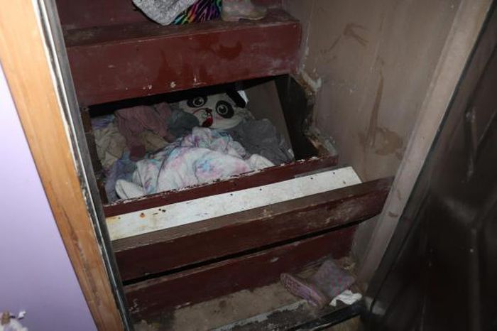 Sau hơn một tiếng t́m kiếm, một điều tra viên nhận thấy các bậc thang dẫn xuống tầng hầm được xây dựng rất kỳ lạ. Họ dỡ bỏ một số bậc và phát hiện ra “một đôi bàn chân nhỏ bé”.