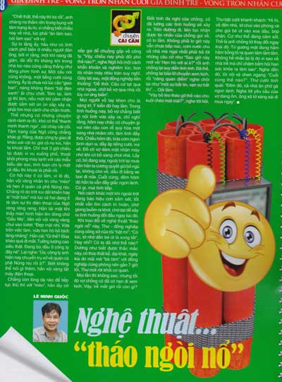 “Vậy bồ tèo tháo gỡ thế nào cho xuôi chèo mát mái?”, nghe tôi hỏi, Thư bật cười khanh khách: “Hì hì, về đến nhà, tớ chui vào phòng và cho gọi bé út vào xoa dầu, bóp chân. Cứ như thể đang cảm sốt. Thế là anh chồng tớ thay đổi ngay thái độ. Từ gương mặt đang hầm hầm bỗng tỏ ra quan tâm lắm lắm. Không hề nhắc lại lý do vì sao về nhà trễ mà chỉ chăm bẳm hỏi han sức khỏe ra làm sao”. Nghe đến đó, tôi vội vã chen ngang: “Cuối cùng thế nào?”. Thư cười tinh quái: “Đêm đó, cả nhà ăn phở gà ngon lành. Nghe lời yêu cầu của vợ đang ốm, ông xã tớ xăng xái đi mua ngay”.