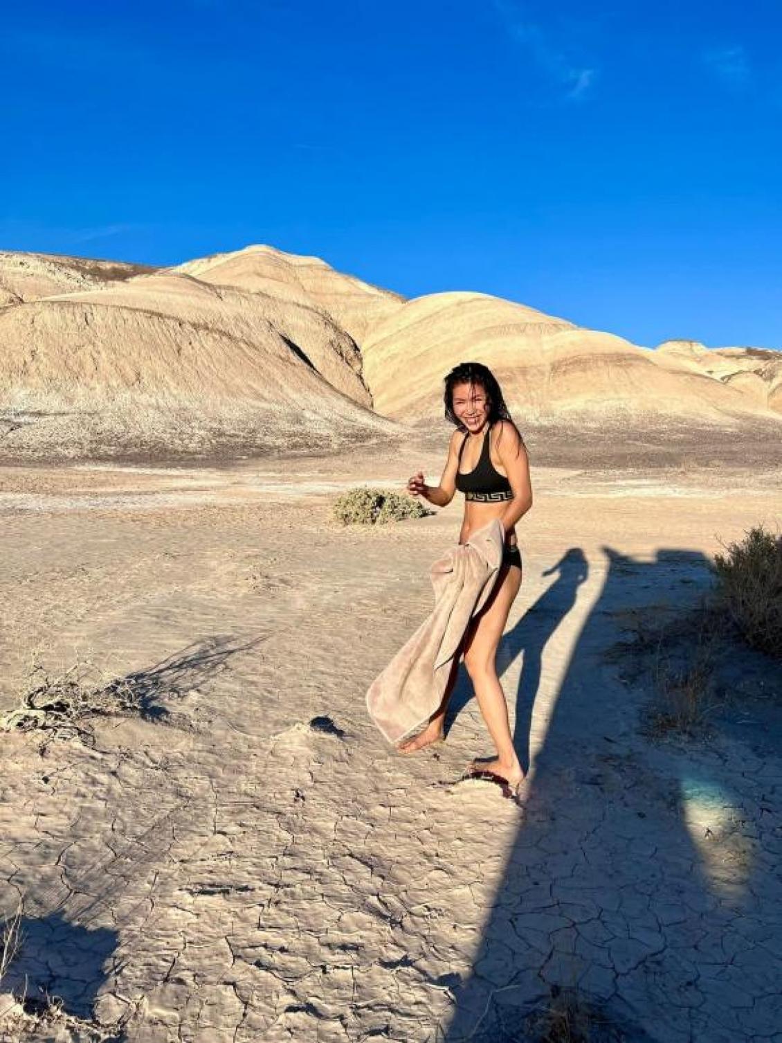 Mới đây, trên trang cá nhân, Minh Tú đăng tải loạt ảnh diện trang phục áo tắm cực nóng bỏng cùng trải nghiệm gội đầu giữa tiết trời nắng gió bên trời Tây. Theo đó, siêu mẫu chia sẻ: "Một trải nghiệm 'tưng tửng' trong chuyến hành trình lần này. Trên đường đi khám phá Death Valley - Thung lũng chết dưới cái nóng 32 độ, tôi đã quyết dừng xe lại bên lề đường và tắm gội dưới khung cảnh sa mạc hùng vĩ. Một cảm giác trải nghiệm thật sự tuyệt vời, khó quên mang đúng tính cách Minh Tú Nguyễn. Làm không chơi là đánh rơi tuổi trẻ".