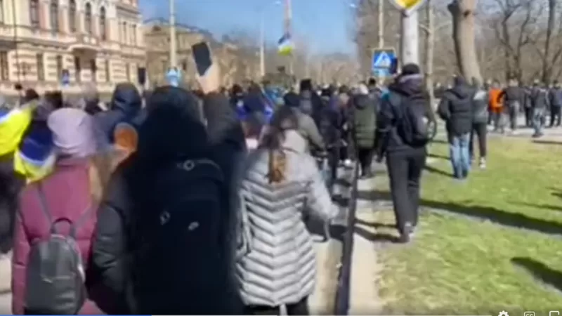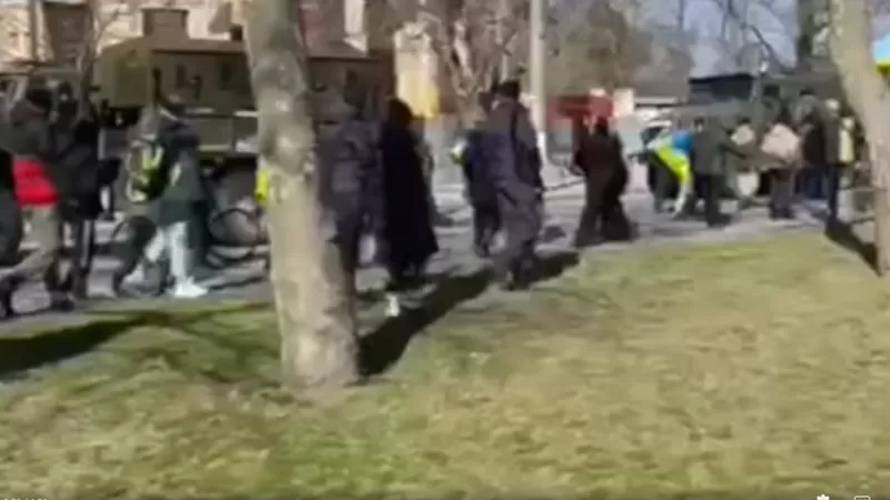 Có thế thấy dòng người biểu tình mang cờ Ukraine, vừa đi vừa hô khẩu hiệu, bất chấp những chiếc xe tăng với binh lính Nga mang súng ống dọc tuyến tuần hành, thậm chí kể cả khi có quân đội Nga hai lần bắn chỉ thiên nhưng những người biểu tình vẫn không dừng bước.