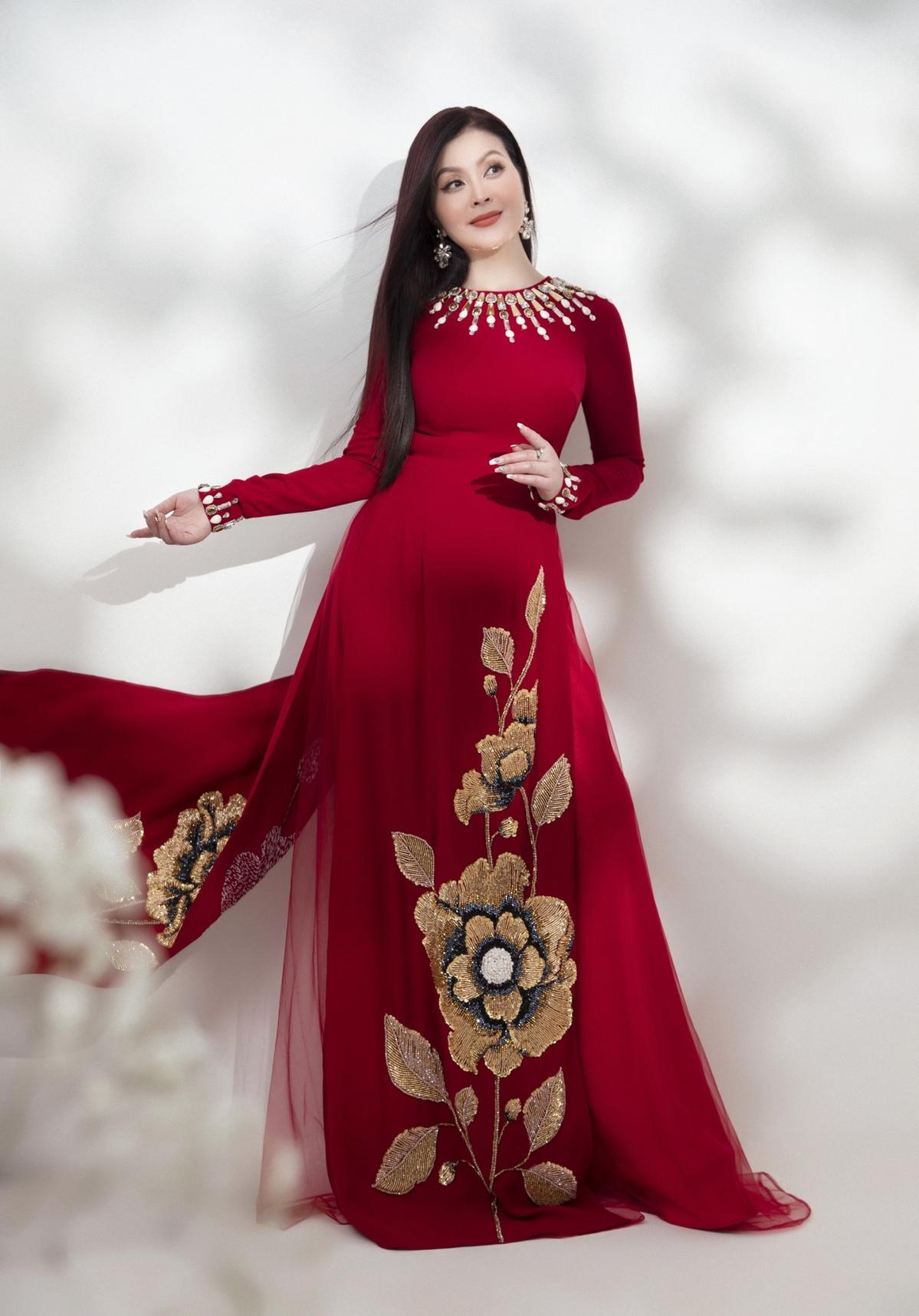 Diễn viên diện mẫu áo dài trơn được đính đá theo phương pháp thủ công ở viền cổ và tay.