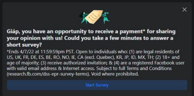 Mới đây nhất, theo chia sẻ của người dùng trên Facebook, MXH này đã gửi thông báo về việc khảo sát khoá Facebook trong khoảng 1 tháng và Facebook sẽ trả tiền cho việc này. Cụ thể, số tiền sẽ nhận được rơi vào khoảng 100.000 đồng - 1 triệu đồng và bạn sẽ được lựa chọn ngẫu nhiên để tham gia vào cuộc khảo sát.