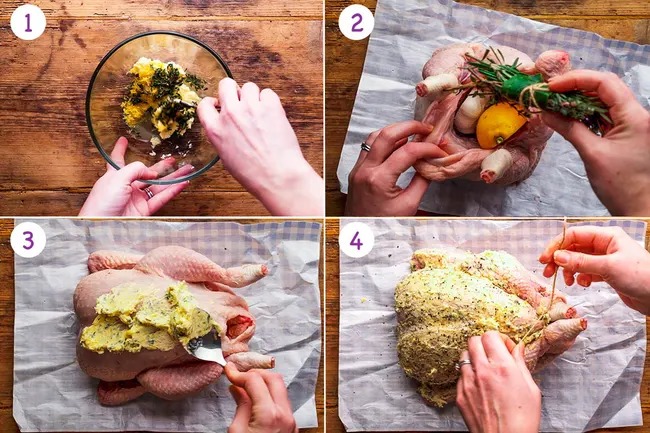 Gà nướng nguyên con tuy phức tạp hơn một chút nhưng vẫn giữ được độ mềm và ngon ngọt của gà. Chỉ cần thêm mẹo phết bơ chanh thảo mộc thì món gà luôn thơm và giòn.