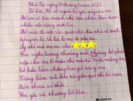Em nghe loáng thoáng mỗi tháng bố phải nộp cho mẹ 15 triệu thì mới đủ nuôi 4 cái miệng ăn, bố hiền lắm chẳng bao giờ làm sai ý mẹ. Cùng lắm mỗi khi tức giận quá thì bố ném điện thoại vỡ thôi. Em yêu và thương bố lắm”.