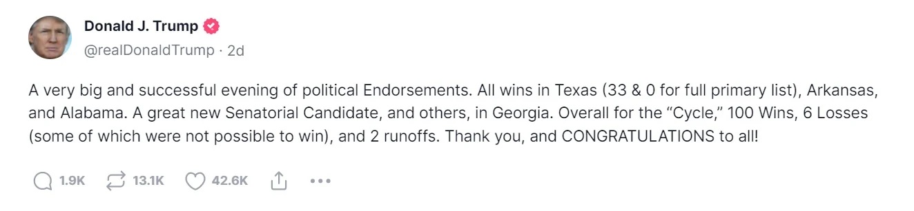 Xác nhận của Tổng thống Trump: 100 trận Thắng, 6 trận Thua và 2 trận Chung kết