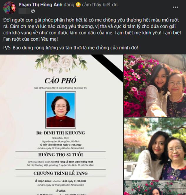Đính kèm bài đăng là cáo phó và những bức ảnh thân thiết của Hồng Ánh với mẹ chồng. Thoạt nhìn cũng đủ nhận thấy mối quan hệ của họ tốt đẹp ra sao.