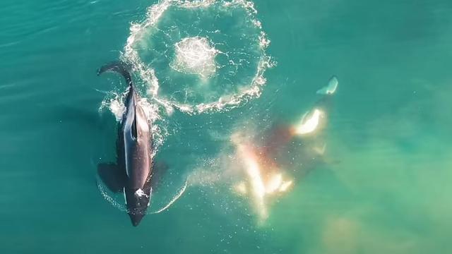 Khi 2 con cá voi sát thủ vây quanh một con cá mập trắng, một con cá voi sát thủ bất ngờ nhô lên từ phía dưới và cắn vào bụng - vốn cũng là điểm yếu chí tử của loài cá mập. Cú tấn công bất ngờ khiến máu con cá mập loang ra.