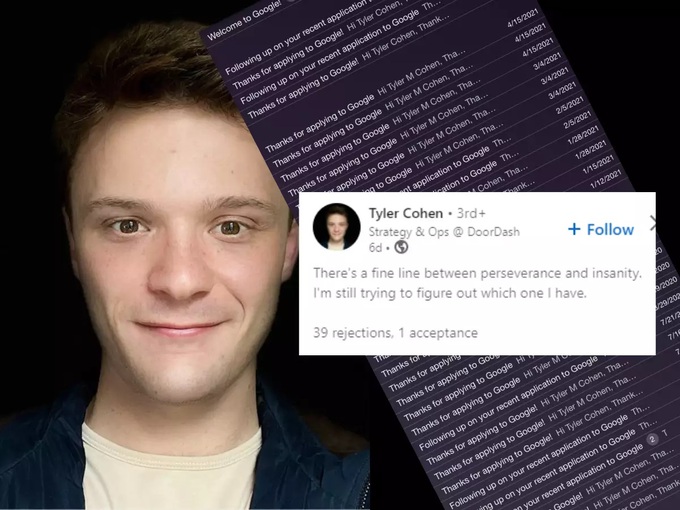 "Có một ranh giới nhỏ giữa sự kiên trì và sự điên rồ. Tôi vẫn đang cố gắng tìm xem bản thân tôi có cái gì. 39 lần từ chối và một lần được chấp nhận", Tyler Cohen viết trên mạng xã hội Linkedin, kèm theo đó là ảnh chụp màn hình cho thấy hàng loạt email từ chối mà Google gửi lại cho Cohen sau khi anh nộp hồ sơ xin việc.