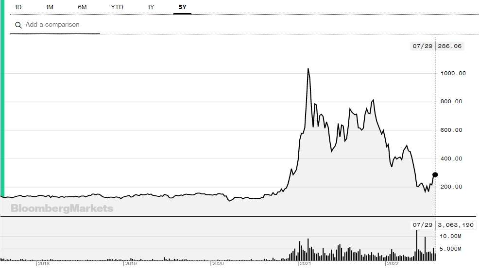Diễn biến giá cổ phiếu MicroStrategy trong 5 năm qua. Biểu đồ: Bloomberg