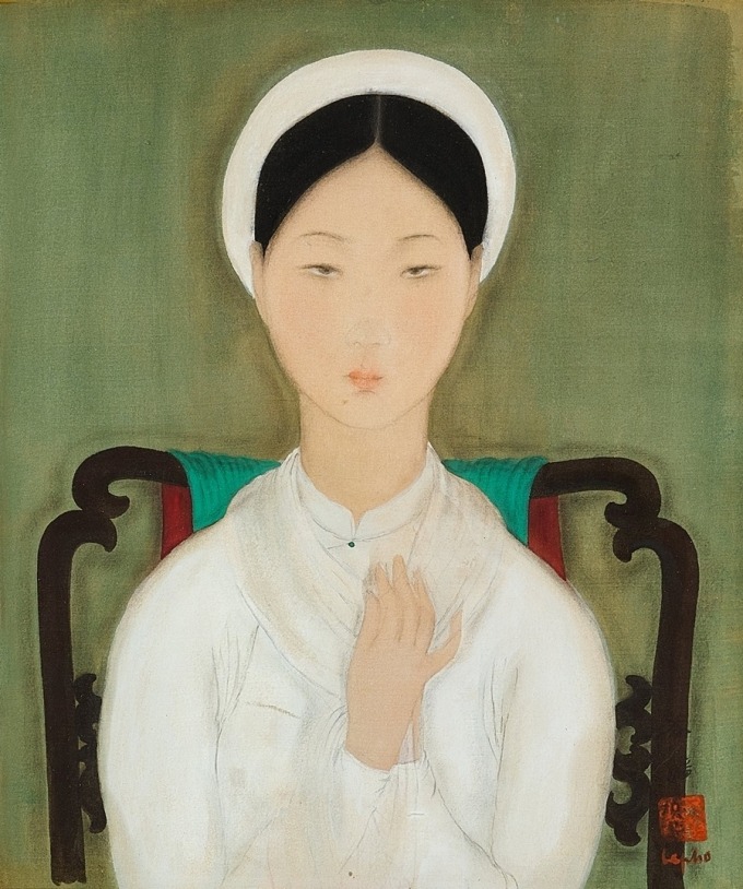 Lê Phổ khắc họa cô gái trẻ mặc áo dài màu trắng ngồi trên ghế gỗ truyền thống, mắt nhìn thẳng người đối diện. Nhân vật quàng khăn và đội mấn đồng điệu. Nhà đấu giá nhận định tác phẩm tinh xảo và đặc biệt hiếm có, tiêu biểu cho kỹ thuật điêu luyện của danh họa trong việc xử lý lụa. Tranh cho thấy tài năng của Lê Phổ trong việc khắc họa vẻ đẹp đài các, nữ tính của phụ nữ Việt. Đồng thời, giúp mở ra phần nào cuộc sống của tầng lớp tinh hoa trong xã hội Việt Nam bấy giờ. Nét vẽ và cách sử dụng màu mang hơi hướng của tranh mực Trung Quốc truyền thống.