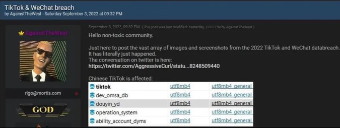 Mới đây, nhóm tin tặc AgainstTheWest tuyên bố đã tìm thấy các vi phạm bảo mật nghiêm trọng liên quan đến TikTok và WeChat. Tin tặc tuyên bố rằng. Chúng tôi đang nắm giữ 790 GB dữ liệu với hơn 2 tỉ bản ghi: gồm dữ liệu người dùng, thống kê nền tảng, mã phần mềm, mã thông báo…