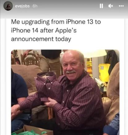 Trong đó, một người đàn ông cầm chiếc áo kẻ giống hệt với chiếc ông đang mặc, cùng chú thích: "Tôi nâng cấp từ iPhone 13 lên iPhone 14 sau công bố của Apple hôm nay".