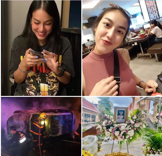 Vụ tai nạn xe hơi xảy ra hôm 26/9 tại Ayutthaya. Theo Khaosod, thời điểm lực lượng cứu hộ tiếp cận hiện trường, xe của nữ người mẫu đã bốc cháy dữ dội. Cơ quan chức năng chỉ có thể phun bọt giảm nhiệt để tránh nổ.