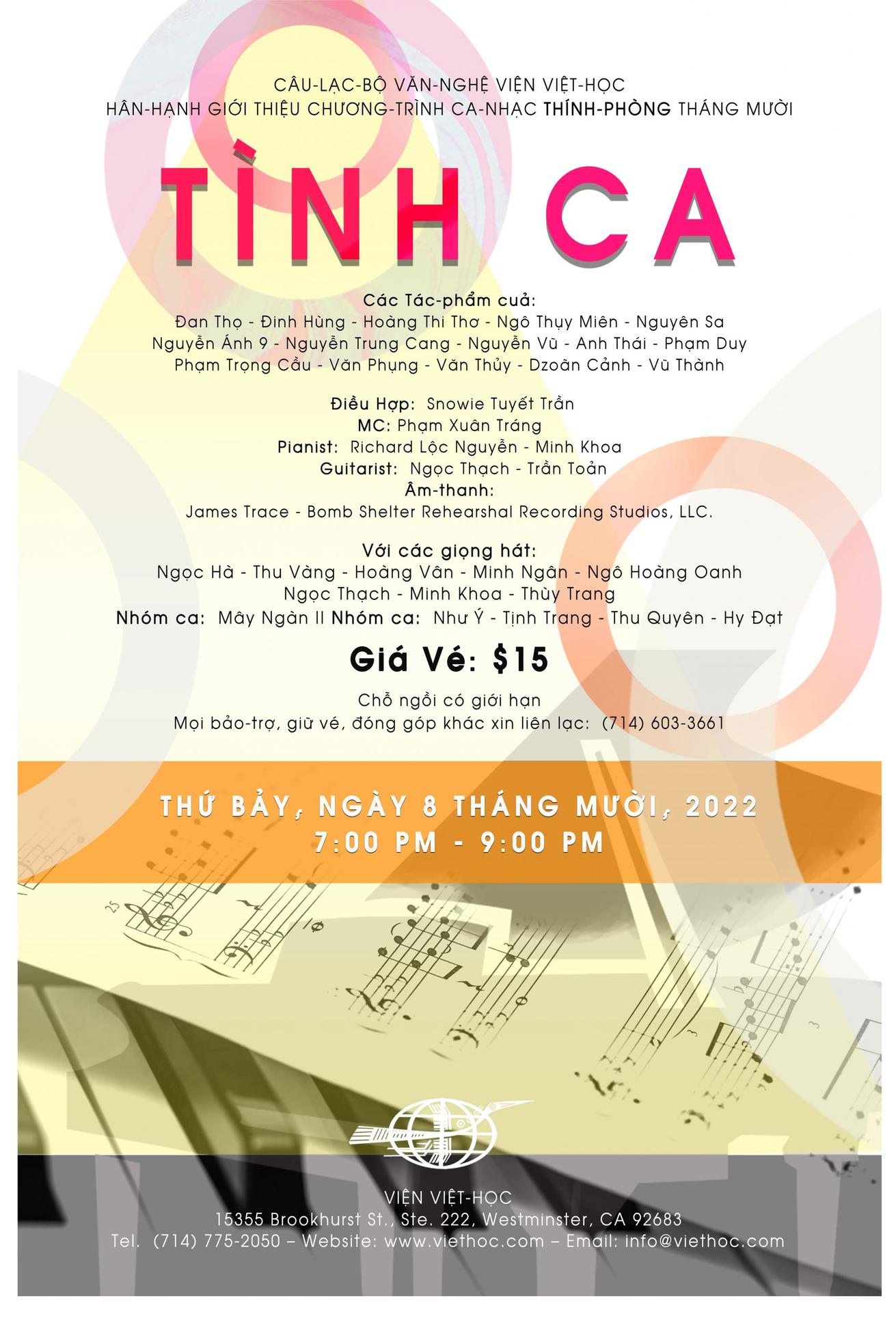 Theo thông cáo báo chí, Câu Lạc Bộ Văn Nghệ Viện Việt-Học sẽ tổ chức một chương trình ca nhạc thính phòng mang tên “Tình Ca” vào tối hôm Thứ Bảy, 8 Tháng Mười. Đây là một sự kiện mới lạ được Viện Việt-Học thực hiện với tâm tư “hy vọng chút thay đổi này sẽ không phụ lòng khách-thưởng-ngoạn.” Tại chương trình, khán giả có thể thưởng thức các tác phẩm của nhạc sĩ Đan Thọ, nhạc sĩ Hoàng Thi Thơ, nhà thơ Đinh Hùng, nhạc sĩ Ngô Thụy Miên, và nhiều nghệ sĩ nổi tiếng khác. Những bài ca bất hủ từ các nghệ sĩ nổi tiếng sẽ được trình bày qua nhiều giọng hát, trong đó có ca sĩ Ngọc Hà, ca sĩ Thu Vàng, và ca sĩ Hoàng Vân. Ngoài ra, góp mặt trong chương trình còn có nhóm ca Mây Ngàn và nhóm ca Như Ý – Tịnh Trang – Thu Quyên – Hy Đạt. Giá vé tham dự là $15 Mỹ kim, và số chỗ ngồi có giới hạn, nên quý vị độc giả có đam mê với âm nhạc thính phòng hãy tranh thủ đặt mua vé sớm. Chương trình sẽ diễn ra từ 7 giờ tối đến 9 giờ tối ngày 8 Tháng Mười sắp tới. Mọi chi tiết về bảo trợ, giữ vé hoặc đóng góp khác, xin hãy liên lạc số (714) 603-3661. Nếu có thắc mắc khác hoặc muốn biết thêm thông tin chi tiết, quý độc giả cũng có thể liên lạc Viện Việt-Học qua số điện thoại (714) 775-2050, E-mail: info@viethoc.com, trang mạng www.viethoc.com, hoặc tại địa chỉ: 15355 Brookhurst St., Suite 222, Westminster, CA 92683.