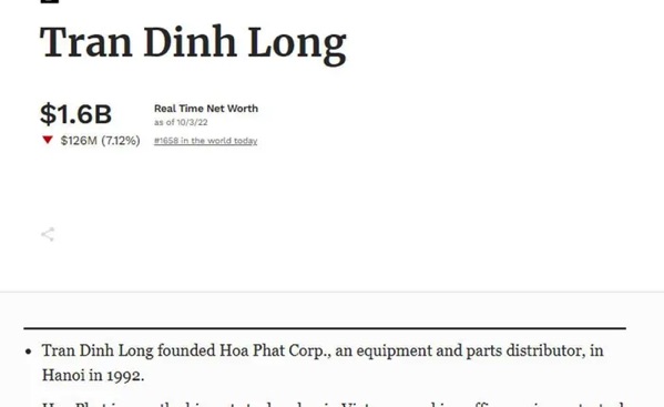 Tỷ phú Hoà Phát Trần Đình Long bốc hơi 1,6 tỷ USD theo tính toán của Forbes. Hồi đầu năm, tài sản của ông Long còn ở mức 3,2 tỷ USD. Hiện ông này có khoảng 1.6 tỷ, theo Forbes.