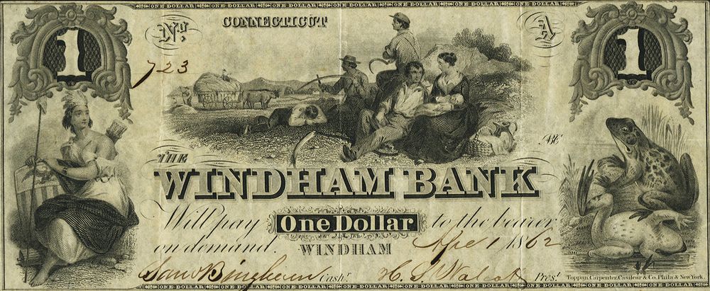 Tiền giấy do Ngân hàng Windham sản xuất có hình hai con ếch, một con đã chết. Ảnh: Mansfield Numismatic Society / Wikimedia