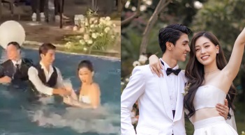 Đám cưới Bình An - Phương Nga diễn ra vào chiều tối 21/10, tại không gian ngoài trời của một khách sạn nổi tiếng ở Hà Nội. Mới đây, khung cảnh Bình An - Phương Nga và các khách mời bị xô xuống nước được hé lộ. Điều này có vẻ nằm ngoài "kịch bản" khi Bình An bị xô xuống đầu tiên, vô cùng bất ngờ.