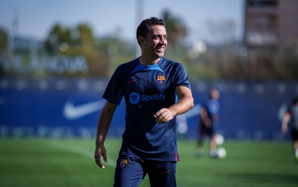 Xavi lạc quan trên sân tập cùng Barca ngày 25/10, một ngày trước trận tiếp Bayern. Ảnh: fcbarcelona.com
