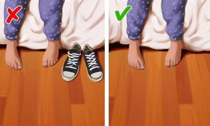 Tránh đặt giày của bạn ở bất cứ đâu gần giường ngủ. Đây là một không gian cần giữ cho sạch sẽ, không có vi trùng và mùi hôi. Nếu bạn không thể quen với việc cởi giày ở nhà, ít nhất hãy áp dụng quy tắc này cho phòng ngủ.