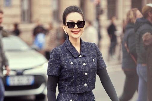 Khi thăm Bảo tàng Louvre, Diễm My diện áo khoác vải tweed kết hợp áo cổ lọ, chân váy xếp ly cùng giày da, găng tay da của Dior (Ảnh: Hoàng Nam).