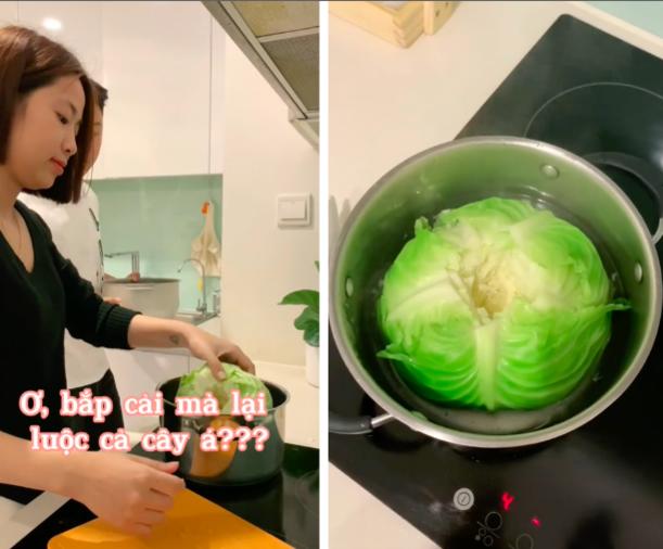 Bắp cải là một trong những loại rau đã quá quen thuộc với người Việt, được sử dụng để chế biến thành rất nhiều món như luộc, xào, muối dưa... Trong đó, có lẽ bắp cải luộc là phổ biến nhất bởi dễ làm và dễ ăn. Với món này, người làm chỉ cần cắt bắp cải thành miếng vừa ăn, rửa rau rồi cho vào nồi luộc. Ấy vậy nhưng mới đây, một đoạn clip ghi lại khung cảnh nấu ăn của một cô vợ với cảnh tượng cho cả cây bắp cải vào nồi luộc khiến anh chồng và không ít cư dân mạng tròn mắt.