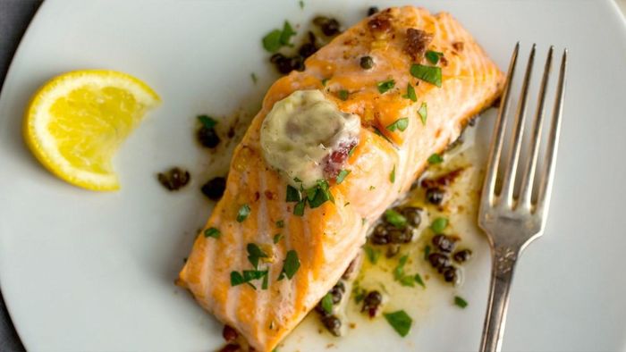 Cá hồi áp chảo sốt bơ tỏi thơm ngon (Ảnh: dienmayxanh.com)