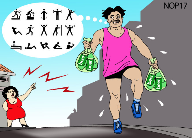 Làm như vậy tôi vừa tập thể dục, đồng thời có gặp người quen thì nói “Đi tập về ghé vào mua vài thứ lặt vặt” để khỏi mang tiếng bị vợ sai vặt. Khi phải đi đổi chai bia, tôi xách hai tay hai giỏ, vừa đi vừa kéo lên, hạ xuống để tập cơ tay.