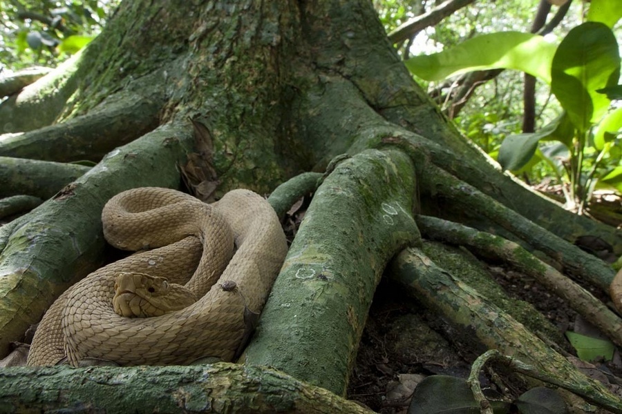 Hổ lục đầu giáo vàng là một trong những loài rắn độc nhất thế giới. Nọc độc của chúng mạnh gấp 5 lần rắn trong đất liền, có thể làm rữa da người khi tiếp xúc. Ảnh: Vix.