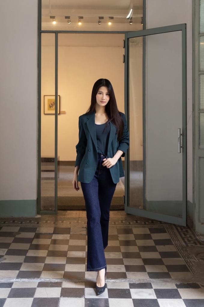 Nghệ sĩ phối quần jeans với áo thun, khoác thêm blazer đi xem triển lãm thời trang tại Bảo tàng Mỹ thuật TP HCM, hôm 17/2.