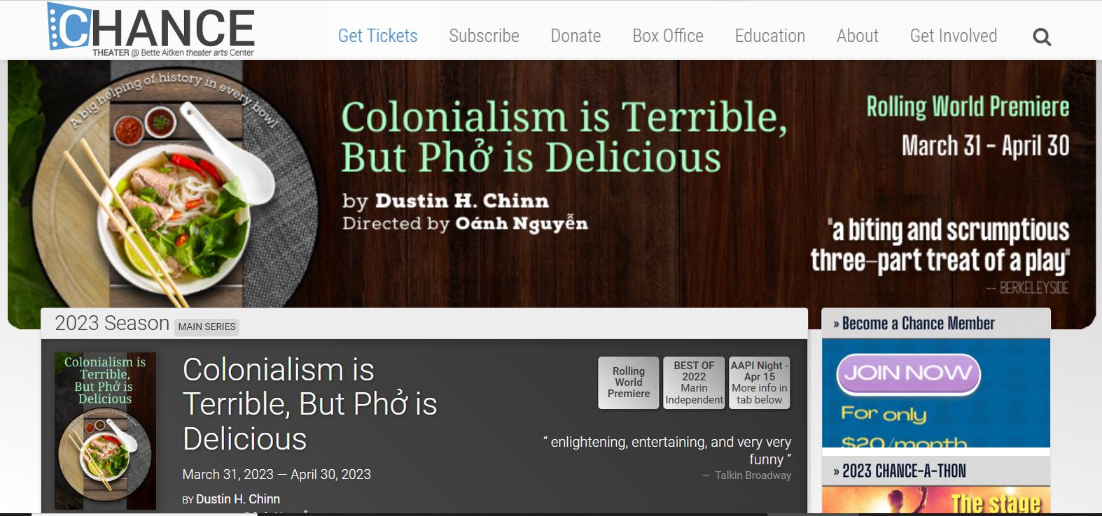 ở hài kịch “Colonialism is Terrible, But Phở is Delicious” do Dustin H. Chinn viết kịch bản và Oánh Nguyễn đạo diễn được dự kiến sẽ bắt đầu trình diễn vào ngày 31 tháng 3 đến ngày 7 tháng 4 tại rạp Chance Theatre, rạp hát chính thức của thành phố Anaheim. Lịch biểu diễn thường xuyên sẽ bắt đầu từ ngày 8 tháng 4 đến ngày 30 tháng 4. Vở kịch của Dustin Chinn lấy cảm hứng từ hai sự kiện lan truyền trên mạng xã hội quanh việc chiếm đoạt văn hóa và ẩm thực. Cốt truyện của vở kịch hài gay cấn này kéo dài nhiều thế kỷ, nhiều châu lục, và nhiều nền văn hóa khác nhau, tất cả được gói gọn trong ba phần. “Colonialism is Terrible, But Phở is Delicious” bắt đầu trong thời gian ngừng hoạt động vì đại dịch. Chance Theatre hợp tác với Aurora Theater Company đã tổ chức đọc kịch bản của vở diễn trực tuyến vào tháng 2 năm 2021. Qua giai đoạn khó khăn, mối quan hệ hợp tác hiệu quả giữa nhà viết kịch Dustin H. Chinn và đạo diễn Oánh Nguyễn cùng với phản ứng tích cực áp đảo từ khán giả đã thúc đẩy cả hai công ty theo đuổi một chương trình đầy đủ. Tác phẩm cuối cùng đã được Marin Independent vinh danh là Vở kịch Hay nhất năm 2022. Phần đầu của vở kịch đã ra mắt tại Aurora Theater, giờ đây phần hai sẽ trình diễn tại Chance Theater, với Oregon Contemporary Theater đảm nhiệm phần cuối cùng vào ngày 19 tháng 5 đến 4 tháng 6.